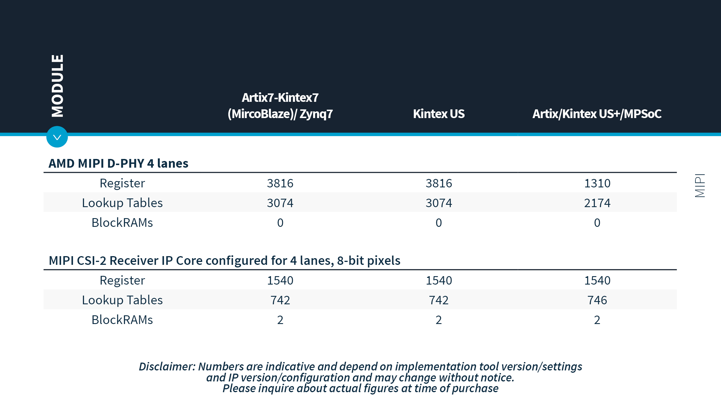 IP 코어는 Zynq7 또는 Ultrascale+ FPGA와 IMX MIPI FMC 모듈을 탑재한 S2I의 MVDK용 완전한 레퍼런스 설계와 함께 제공됩니다. 물리적 인터페이스가 AMD D-PHY 코어에 의해 추상화되므로, 예를 들어 7 시리즈 AMD FPGA와 같은 다른 FPGA 플랫폼으로 설계를 쉽게 이식할 수 있습니다.